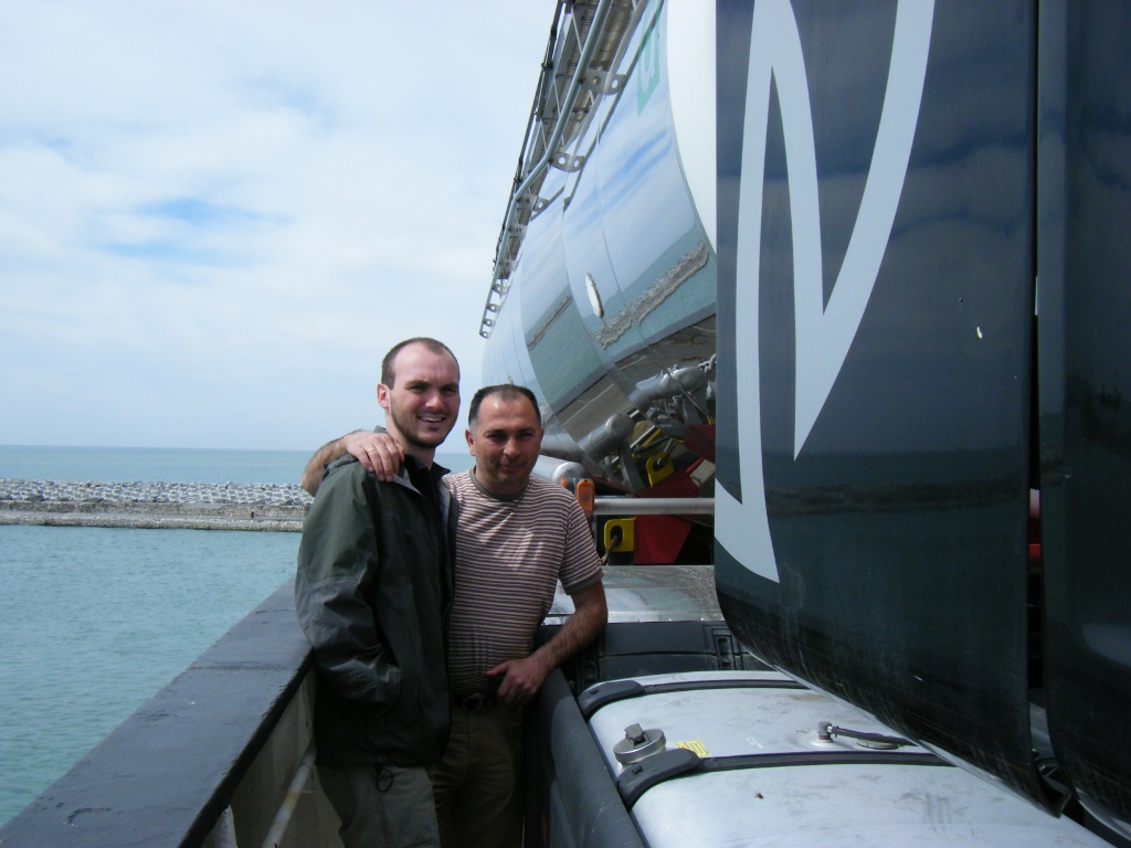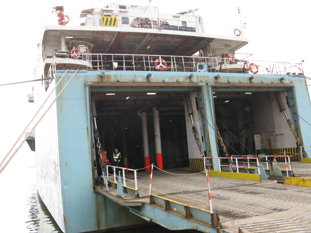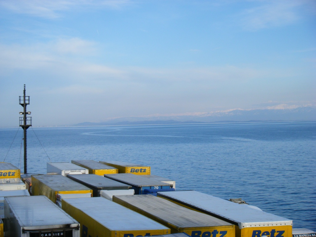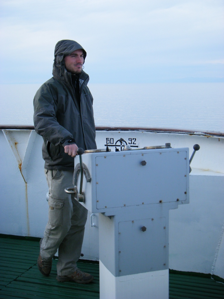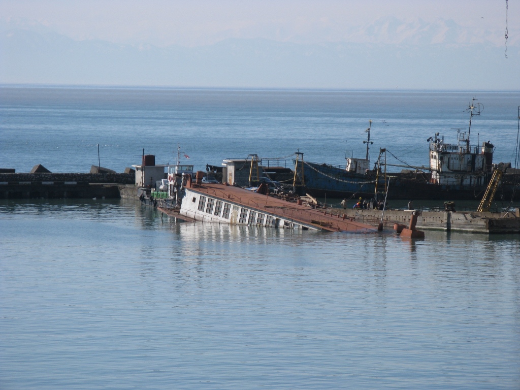 On vous a fait saliver avec notre petit jeu, il est temps de vous donner quelques nouvelles un peu plus en detail. Nous quittons donc Burgas pour prendre le bateau. Au port c’est complique, enfin on y comprend rien. On suit un jeu de piste entre la douane et le bateau pour obtenir un “cartone”. D’autant qu’on sait que le bateau part dans l’apres midi et il est 14h… la pression monte. A la douane, le policier me dit, “non non on ferme revenez dans 2h”, et puis un autre derriere en anglais “qui etes vous ? les francais a velo ?? donnez moi votre passeport”. Et hop tout s’accelere 2 minutes apres on embarque sur le bateau. On croit pouvoir etre sur le sol russe dans moins de 4 jours… douce illusion. 24h apres on est toujours au port. Le capitaine nous explique, blase, “probleme avec la douane…”. On partira vers 18h avec a bord beaucoup de camions et leurs conducteurs. Ambiance camionneurs dans le mess ! A bord, grace au capitaine, on accede au poste de pilotage. Il passe du temps a nous expliquer les instruments, et a nous parler des problemes de son pays. Nous sympatisons avec Georges qui ramene 30000 litres de cognac francais pour la russie. Il s’obstine a nous offrir a boire. On discute de notre trajet. Tout le monde a des plans et de la place dans son camion pour nous faire gagner du temps. Il est difficile de faire comprendre que nous ne prendrons pas le chemin le plus court (qui ne passe pas par Volgograd) car l’ambassade nous le deconseille. Quand on dit que c’est a cause de la tchetchenie, ils rigolent de bon coeur. Georges nous prepare l’itineraire avec son GPS.