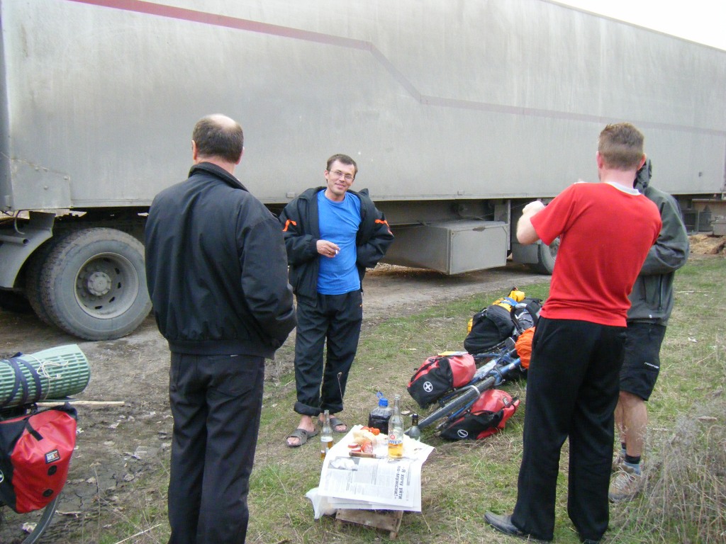 Un jour d’escale a Poti, et nous arrivons dans la baie de Novorossiysk. On jette l’ancre et on attend. Le capitaine nous explique qu’il n’y a qu’une place dans le port pour notre type de bateau. En fait il y en a 2, mais la douane refuse d’en controler un second, cela ferait trop de travail. On attendra donc plus de 24h. Sur le pont on se prepare, les camionneurs admirent notre equipement et se demandent bien quelle classe de permis PL faut-il pour ce type de remorque. A la douane les camions passent au compte goutte. On laisse Georges qu’on doit rejoindre ce soir a l’hotel, on aura appris au passage qu’il n’est pas camionneur, mais qu’il a une entreprise de 15 camions qui importe du cognac. A la frontiere, il nous faut vider toutes nos sacoches sous le regards de 5 douaniers les mains dans les poches (dont pas un ne parle anglais). Le capitaine depite leve les yeux au ciel en voyant la douane nous faire tout deballer. Les douaniers ne nous croit pas quand on leur dit que l’on a que 2 Leva sur nous (=1euro). On ne craint pas les bakshishs ! A l’hotel, on retrouve le “cousin” de Georges qui nous emmenent dans un autre hotel. On lui demande de rouler doucement pour que les velos ne se ballade pas trop dans la camionette. Precautions inutile… il roule comme un russe. En fait non, apres reflexion, il roulait prudemment pour un russe. Il faudra faire attention. Le soir on dine avec Georges, son “cousin” et ses amis, dans un restaurant ukrainien. Georges attend en fait ses “dokuments” puis compte partir pour Rostov avec deux camions. Il nous propose de nous avancer un peu. Le lendemain on visite donc Gelendgik et le soir on rejoind Georges. Ces premiers pas accompagnes nous rassurent, on apprend un peu de vocabulaire. A 1h du matin seulement, la douance libere le camion.