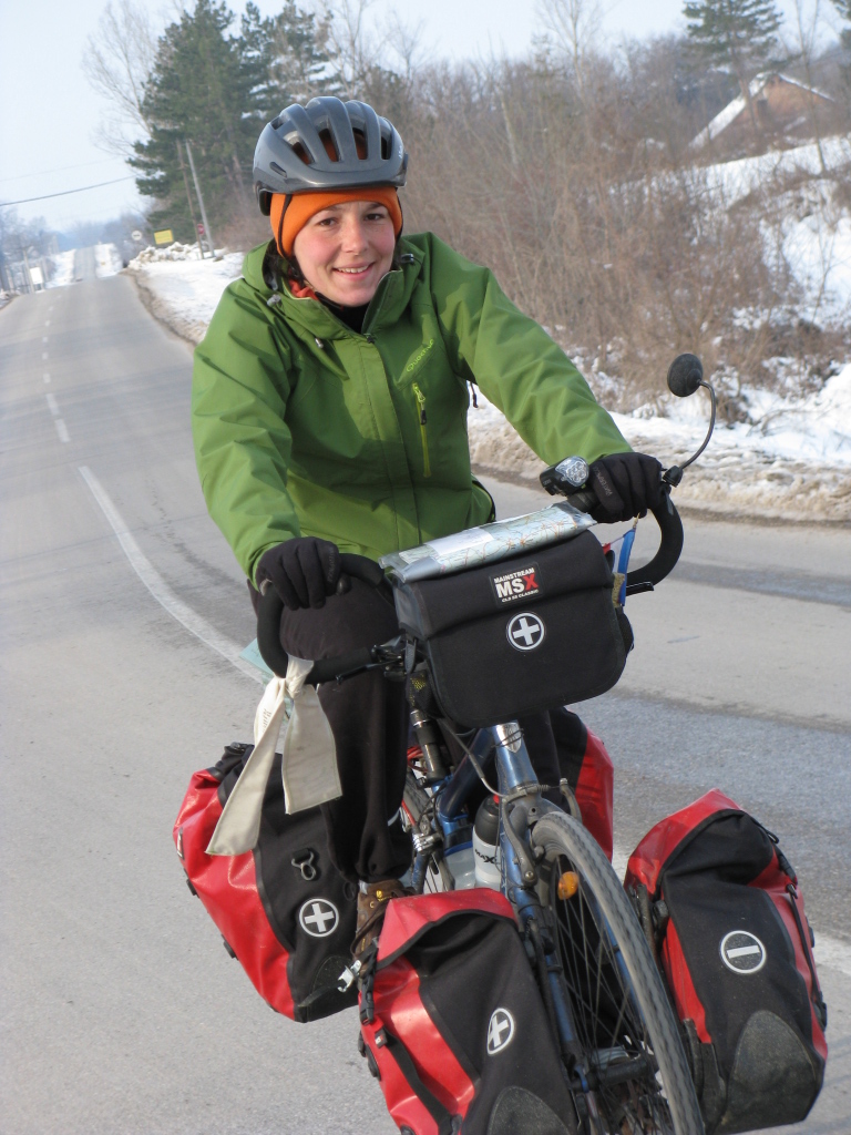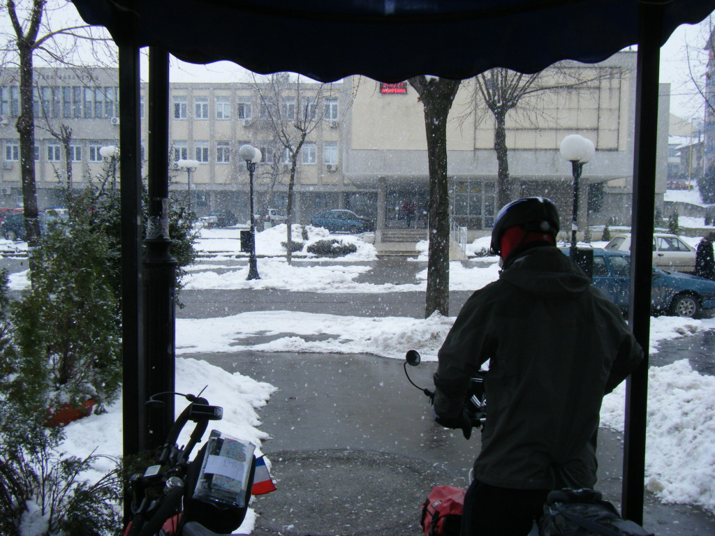 Pour éviter les gros axes (mauvais souvenir d’hier, les camions nous pluverisent de boue à chaque fois), nous ‘coupons’ par la montagne malgré les gros flocons qui tombent en ville. Nous voulons arriver à Rudnik ce soir, malgré les sourcils froncés des habitants locaux et leur conseils de s’arrêter. Mais nous sommes bien dans cette nature… On comprend en entrant dans la ville, après des passages un peu difficiles dans la neige, que c’est une… station de ski !! Nous sommes extenués, mais fiers d’être ici en vélo.
