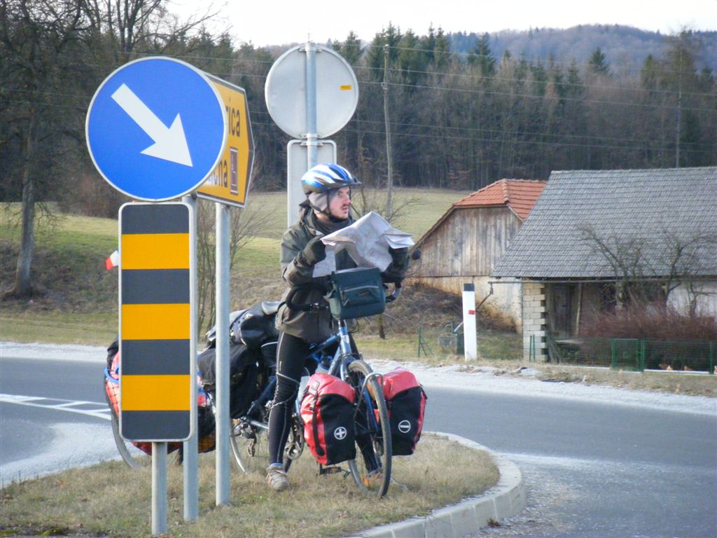 Dimanche on passe la frontiere et on sort de l’UE ! Le thermometre ne passe pas 4°C, mais il fait grand beau, donc ca roule ! On arrive a Zagreb pour dejeuner et on retire nos premieres devises croates. A ce moment un type vient discuter avec nous. Pendant qu’on discute, on entend soudainement un gros coup de feu. Nous sursautons, (on croyait pourant que la guerre etait finie…) mais il nous rassure en rigolant, c’est le coup de canon de midi. Arrives sur la place principale, un jeune croate, Martin m’aborde pour discuter un peu et nous propose de venir dejeuner avec lui, il doit lui-meme retrouver un ami. Volontiers ! C’est tres drole car l’ami en question et l’homme rencontre pendant le coup de canon… Repas vraiment sympa, Martin nous donne beaucoup d’info precieuses sur son pays et nous fait visiter a velo sa ville qu’il aime. Il nous mene par des chemins d’initie aux portes de la ville et nous met sur la route de la suite. Merci Martin !!