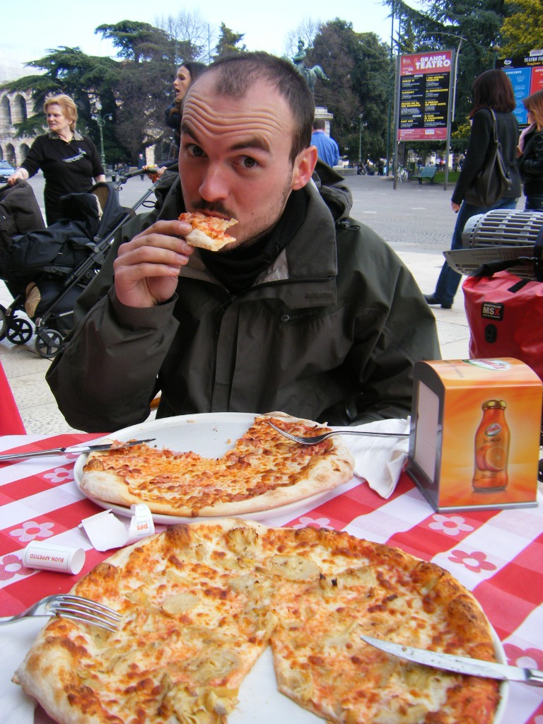 Nous nous dirigeons vers Verona avec l’idee d’y dejeuner. Le vent de face ne nous demoralise pas, et nous serons sur la place des arenes, en gros touristes pour manger la pizza que nous nous etions promise. On profite de la ville, photos, visites… Alors que nous faisions les cakes sur la place des arenes, Camillia, journaliste au Corriere della Serra, nous aborde dans le but de faire un article sur notre voyage. Rendez-vous 1h plus tard, meme lieu, pour faire des photos. Pendant ce temps nous continuons notre tour en ville et rencontrons un centurion qui fait figuration dans le centre historique. Ce dernier est croate et nous propose le gite pour la nuit. On prend son adresse et le rejoint en fin d’aprem. La soiree est animee de discussions en tout genre puisque Tom, en plus d’aimer son pays plus que tout, aime les sujets polemiques en tout genre. Nous passons tout en revue dans un mix d’anglais, d’anglais et d’italien debite a grande vitesse ! Nous prenons nos premiers ressentis sur le conflit d’ex Yougoslavie. Les semaines a venir ne seront pas de trop pour en cerner les grands traits… On apprend de nouvelles traditions telles que le vegetarisme, les 5 respirations avant le repas…