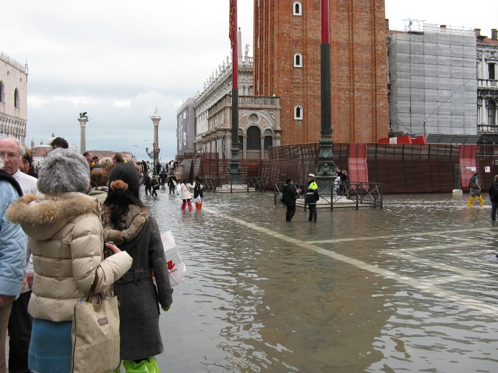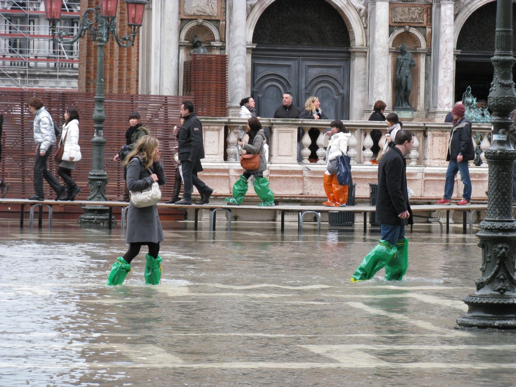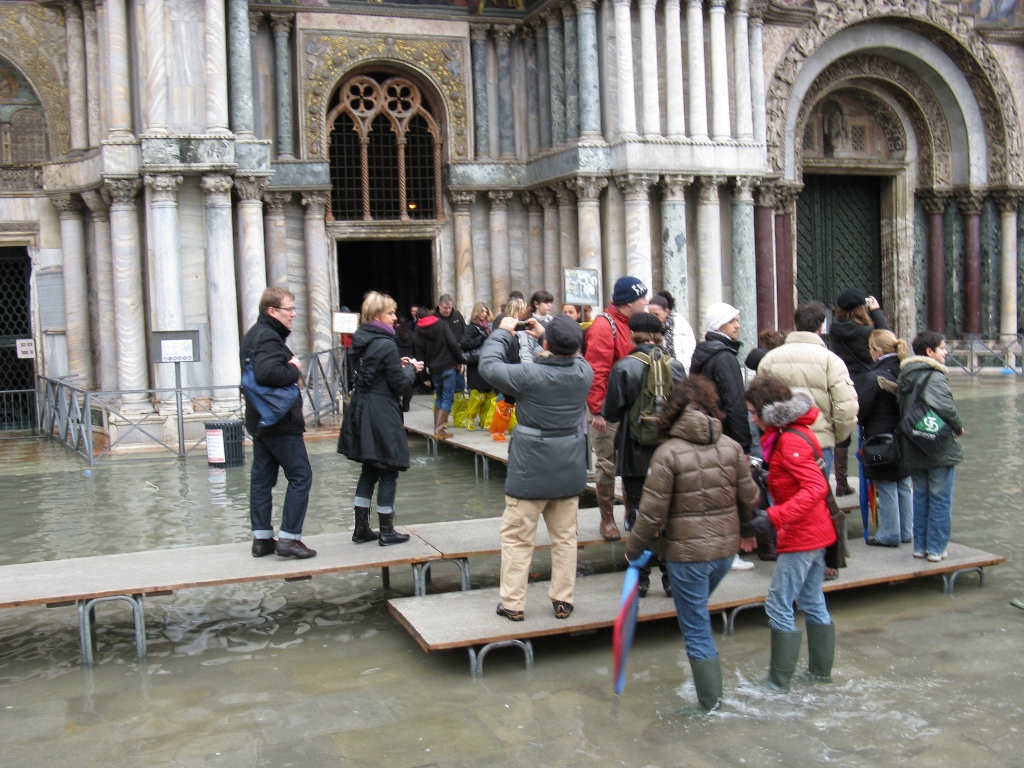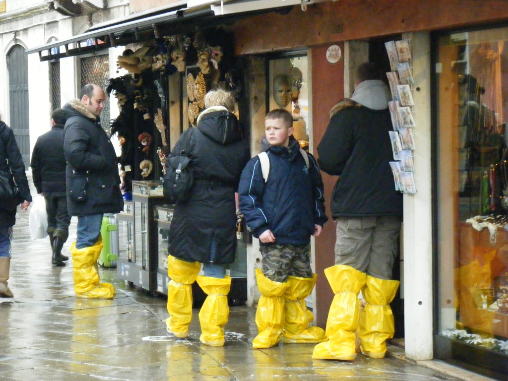 Nous arrivons a Venise tres tot… trop tot ? Non pas qu’il y ait beaucoup de touristes a 9h dans les rues, mais la maree inonde les rues… Notre matinee se transforme en un vrai jeu de piste pour tenter d’eviter les rues mouillee (30 cm d’eau). Rapidement nous sommes coinces… Ne souhaitant pas investir dans des bottes-sac poubelle a 10 euros, nous nous rabattons sur cette celebre maxime : Patience et longueur de temps font plus que force ni que rage : la mer descend. Nous daignons prendre le poduim a touristes pour atteindre la place San Marco. La magnifique basilique rayonne de 1000 couleurs qui se marient “a merveille” avec les fameuses bottes-poubelles des touristes chinois. On profite de l’eclectisme de cette ville pour charger nos sacoches de nouveaux livres en francais…