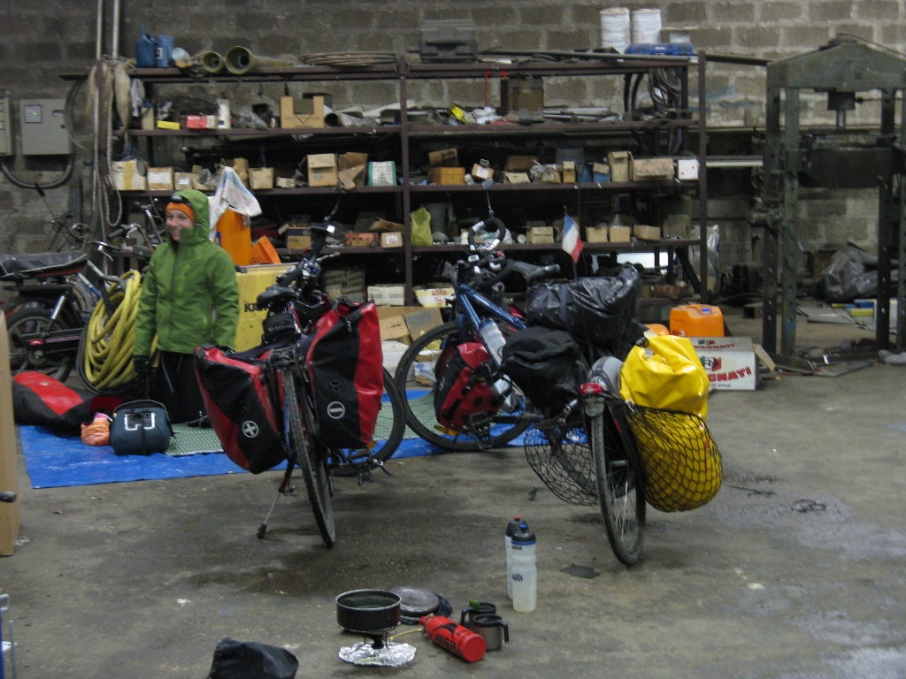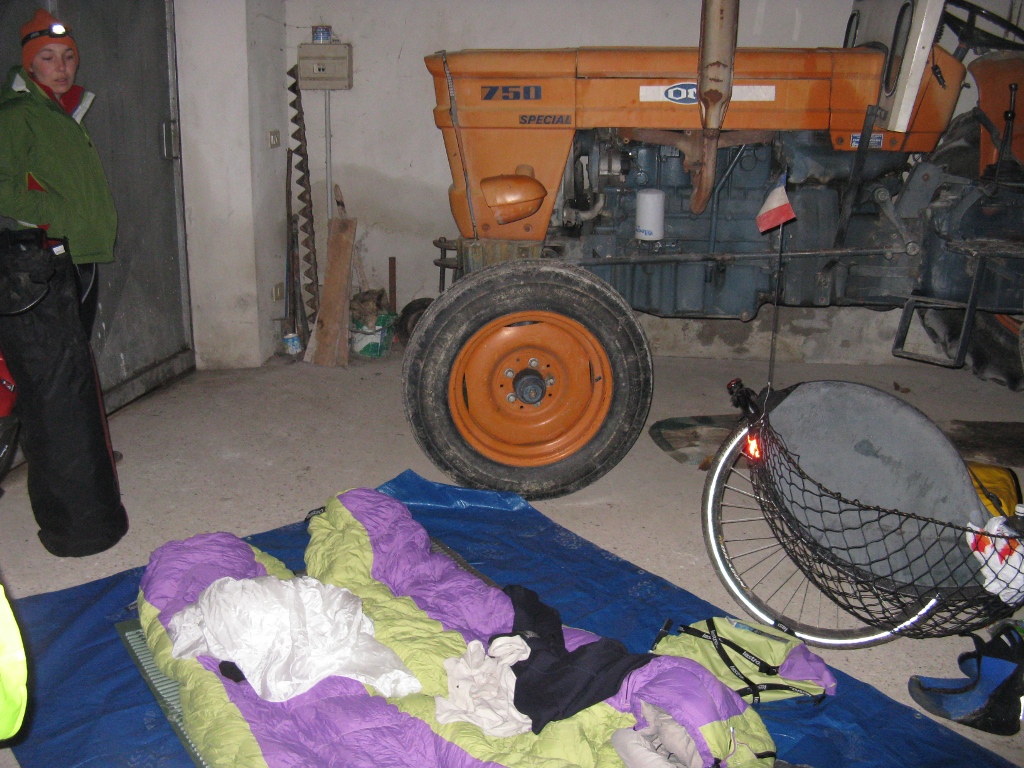 Ca y est nous avons repris les forces necessaires pour reprendre la route sur la neige devenue de la soupe. La journee a un gout de mouille et est un peu dure pour le moral et les jambes. Quand vient l’heure de chercher un logement, ca se complique encore un peu. Je n’ai pas le gout d’aller demander aux gens un bout de terrain, et pourtant c’est la, notre seule solution. Pierre tente sa chance aupres d’un agriculteur qui dit, en regardant ses quelques hectares de terrain, ne pas voir ou il pourrait nous accueillir. Nous sommes un peu depites, mais nous reprnons la route, avec, a chaque refus le stress qui avance avec l’heure. En sortant du village, nous voyons un agriculteur dans sa grange… je tente ma chance, un peu a contre coeur (j’ai encore l’amertume du refus). Il ne voit pas d’inconvenient a nous preter un bout du garage de ses tracteurs “si nous ne le derangeons pas”. Sans probleme, nous sommes trop content d’avoir un toit ! Quand je vais pour demander ou nous pourrions remplir nos bouteilles d’eau, il en profite pour me presenter a sa femme et son fils. Et la, je subis un reel interrogatoire : quel age as-tu ? combien de freres et soeurs ? pourquoi vas-tu en Mongolie ? est-ce que vous etes en couple ? as-tu un revolver ? que pense ta maman de ce voyage ?… tout ca, sur le pas de la porte. J’avous qu’au bout de quelques minutes je redoutais les questions qu’elle pouvait trouver… Elle m’a finalement lachee et je suis allee cuisiner avec Pierre. Une heure apres, leur deuxieme fils vient nous voir dans le garage pour discuter un peu en anglais. Il repars puis vient nous proposer de venir diner. Nous acceptons, meme si nous n’avons plus tres faim apres notre soupe (nous vivons au rythme su soleil, et il etait deja 19h…). Nous nous rendrons compte qu’il faut un peu de temps a chacun pour sortir de ses peurs, nous comprendrons que chacun a ses raisons d’avoir un peu peur, et nous passerons une excellente soiree grace a cette famille qui a su depasser ses aprehensions. Au menu : pates faites par la maman, avec les oeufs des poules du papa, les legumes du jardin, les pommes du verger, les bugnes de carnaval… Petit dejeuner au chaud et c’est parti pour de nouvelles aventures, forts de cette rencontre inesperee !