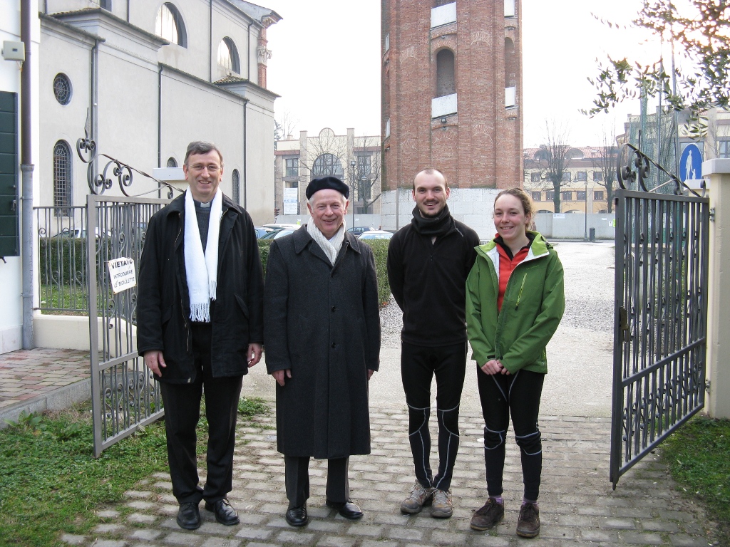 On repars, devinez comment … sous la pluie ! A 16h, on en peut plus, on s’arrete devant une grosse eglise et on sort la technique du samedi soir : demander au presbytere a mettre nos velos au sec pour pouvoir aller a la messe. On decouvre en puissance 10 l’accueil a l’italienne : le pretre nous propose une chambre, et nous donne rendez-vous pour le diner a 19h30. Repas anime par 3 cures en pleine forme et une cuisiniere hors paire. Quel accueil, spontane et chaleureux ! Comme tous les italiens rencontres, ils s’offusquent que Venezia (Venise) ne soit au programme. Ils nous proposent de garder nos velos pour la journee et de prendre le train pour la journee.
