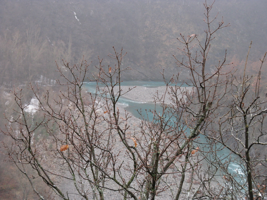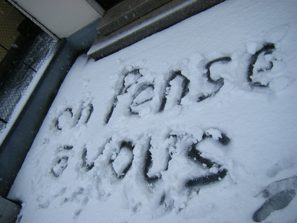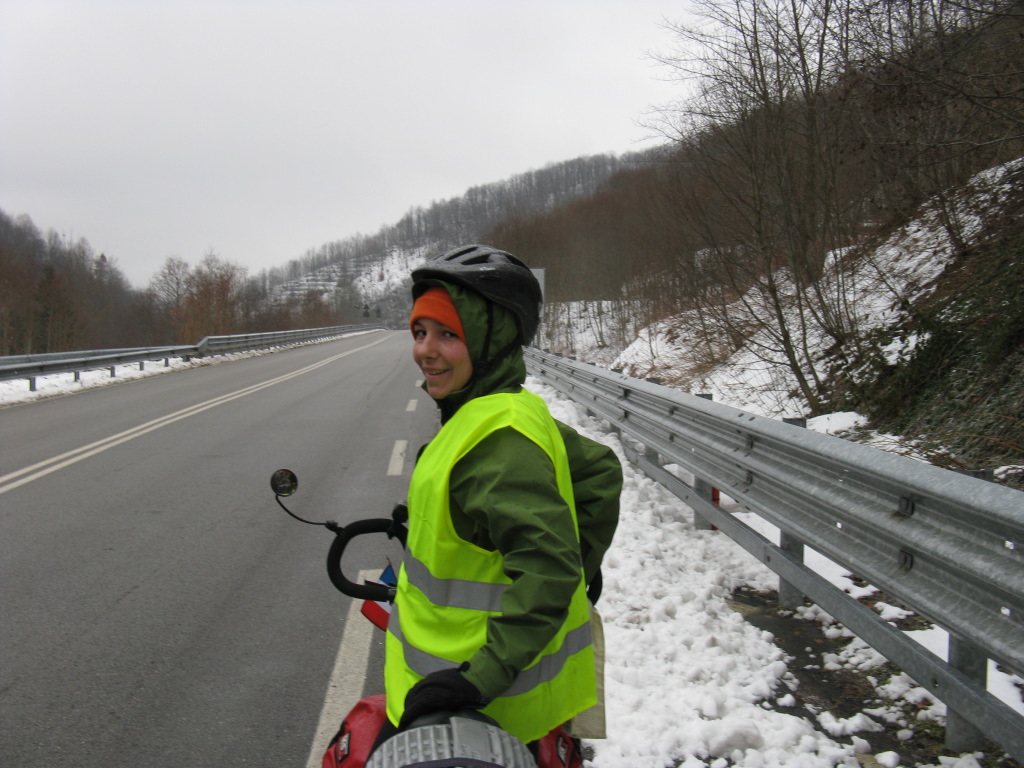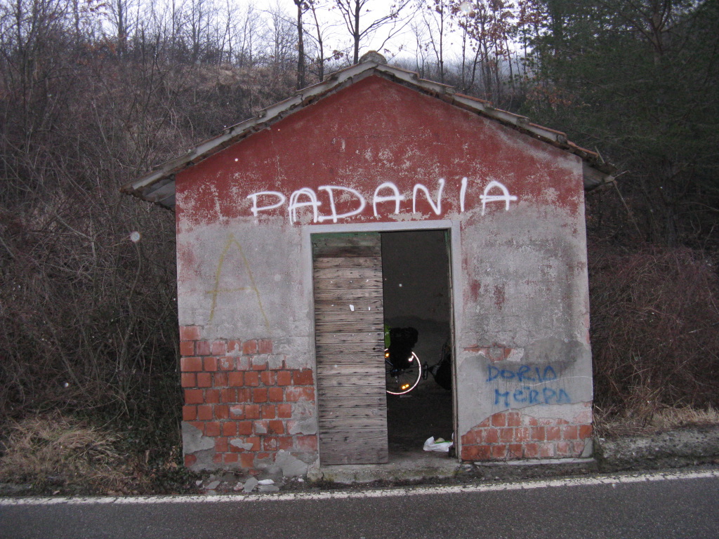 Mais c’est une nature hostile et froide que nous avons trouvé. On a fait quelques kilomètres de montagne, pour atterir dans un petit village, ou tout est en pente… Après avoir joint à notre cause la moitié du village, nous finissons par trouver un jardin en escalier ou nous passerons une nuit froide entre la grande route et le bar du village. Reveil givré mais au sec, nous reprennons la route… optimistes. Le ciel se couvre, et la neige se met à tomber, à ce moment nous ignorons que nous sommes à 1600m d’altitude. La neige recouvre la route. L’hostilité de la nature fait ressortir la chaleur des italiens, qui nous soutiendront (Claire-Marie ne dira plus de mal des 4×4) On s’arrete pour manger vers 15h dans un cabanon de la DDE italienne, finalement la neige redoublant ce sera notre abri pour la nuit. Et dire qu’hier à peine nous roulions en T-Shirt.