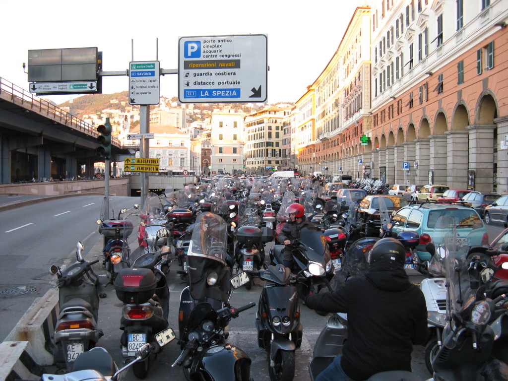 Meme en Italie, la circulation génoise est réputée… A Albenga, le papi qui nous a aidé à nous loger, un ancien cycliste, nous a promis qu’on aurait peur à Genova. C’était sans compter sur la maitrise de nos montures et du code de la route local…